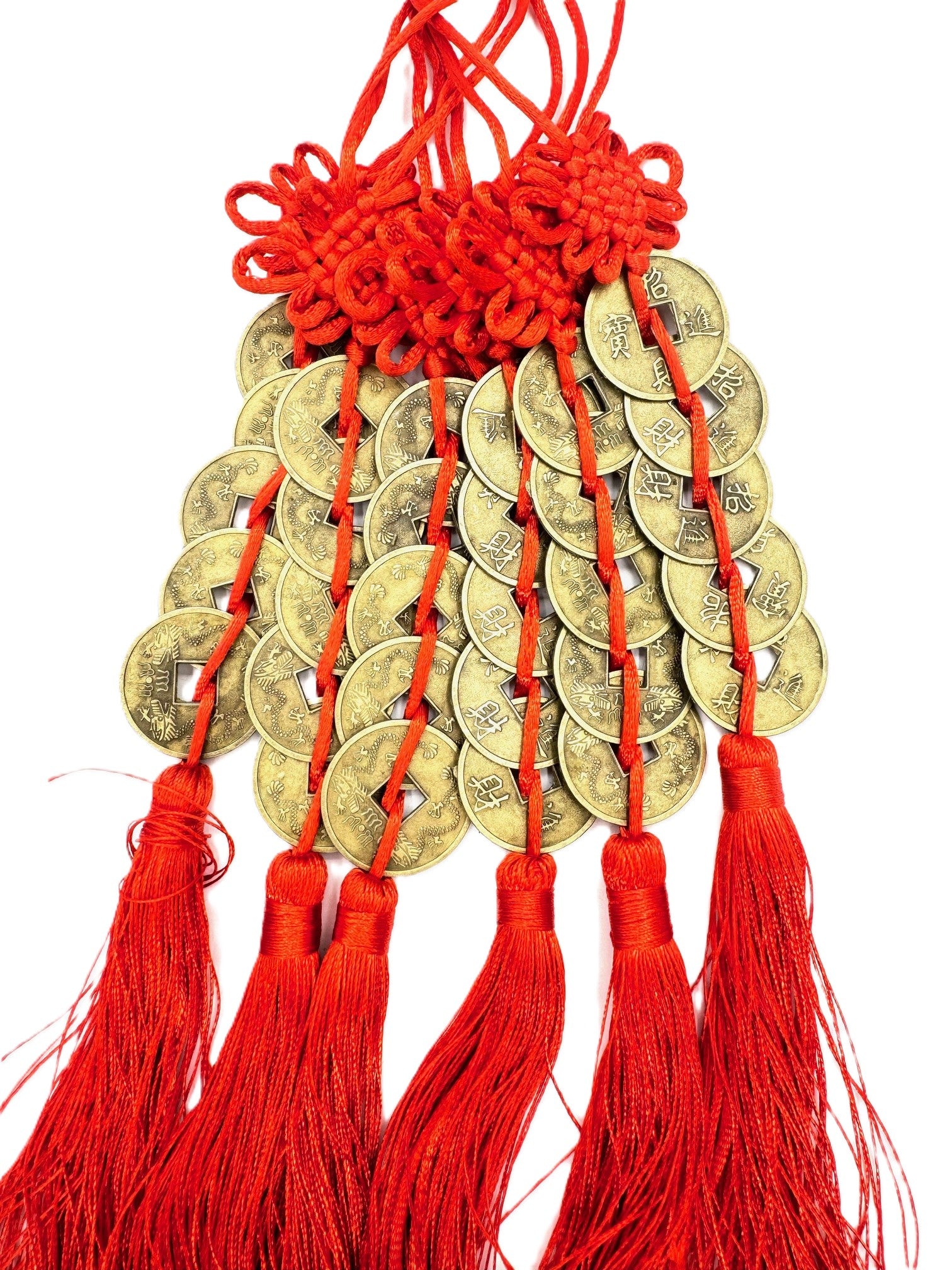 Chinese Glücksmünze met 5 Cent zusammen (6 Stück). De ophanging kan zo worden uitgevoerd dat de glans van de decoratie wordt verhoogd.
