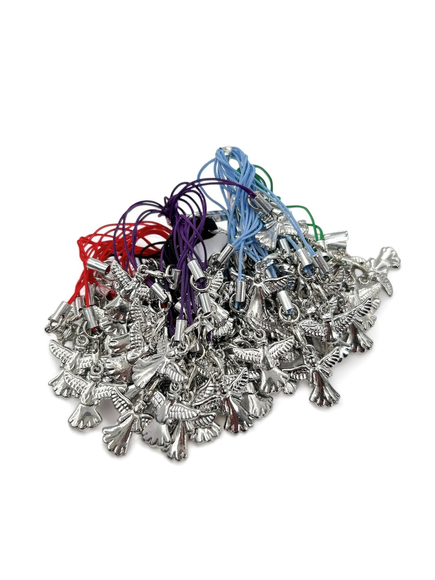 \n50 stuks metalen engel gelukshangers in een zakje, vijf gemixte kleuren van lusjes in een zakje. elke kleur van 10 stuks.