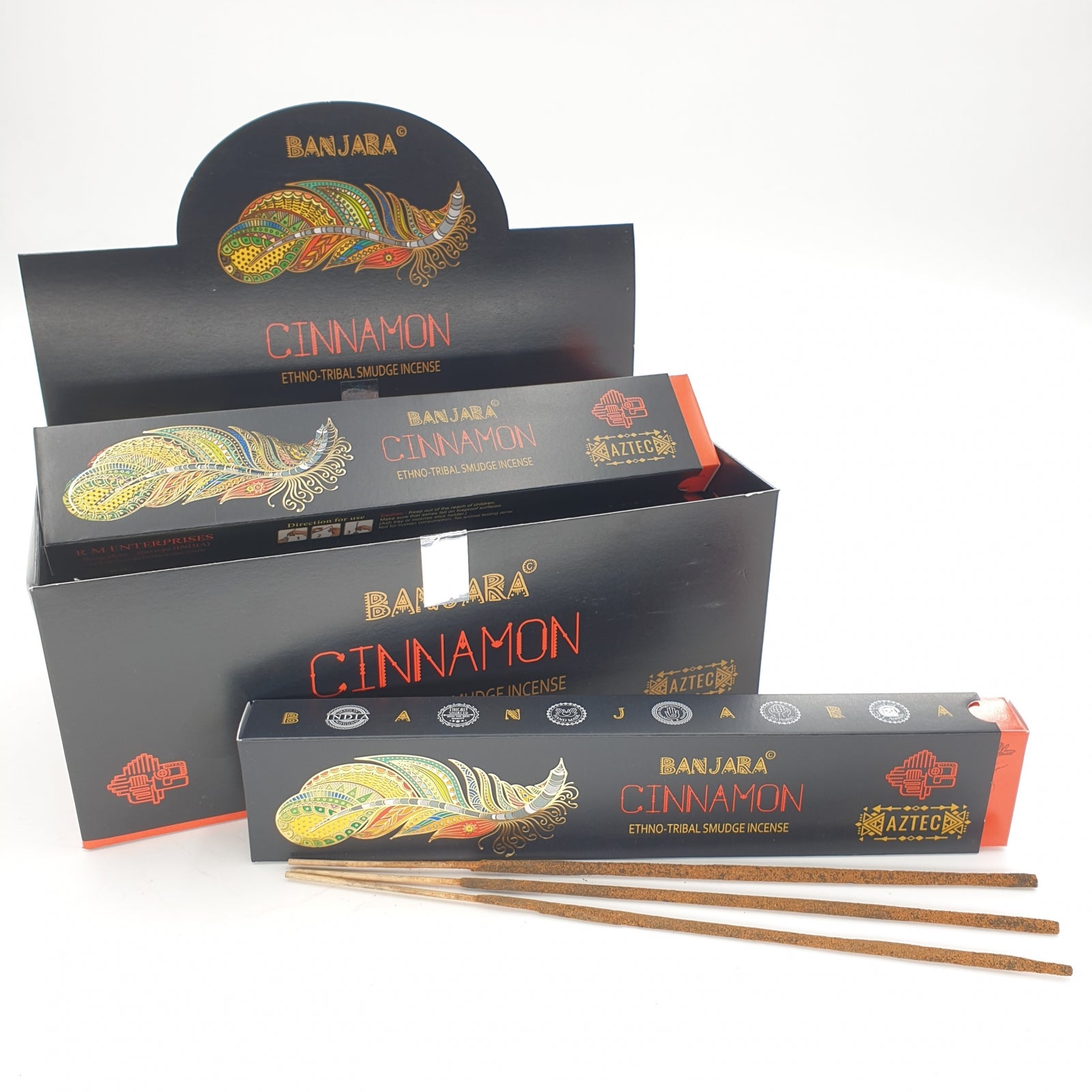 Banjara Aztec Natural Weihrauch - Kaneel\nBanjara Aztec Natural Wierook is een natuurlijke en organische Weihrauch. Der Weihrauch ist in verschiedenen Düften erhältlich. Alle Räucherstäbchen sind handgerollt.\nGröße:\n15 Gramm pro Packung en 12 Packungen in een doos.