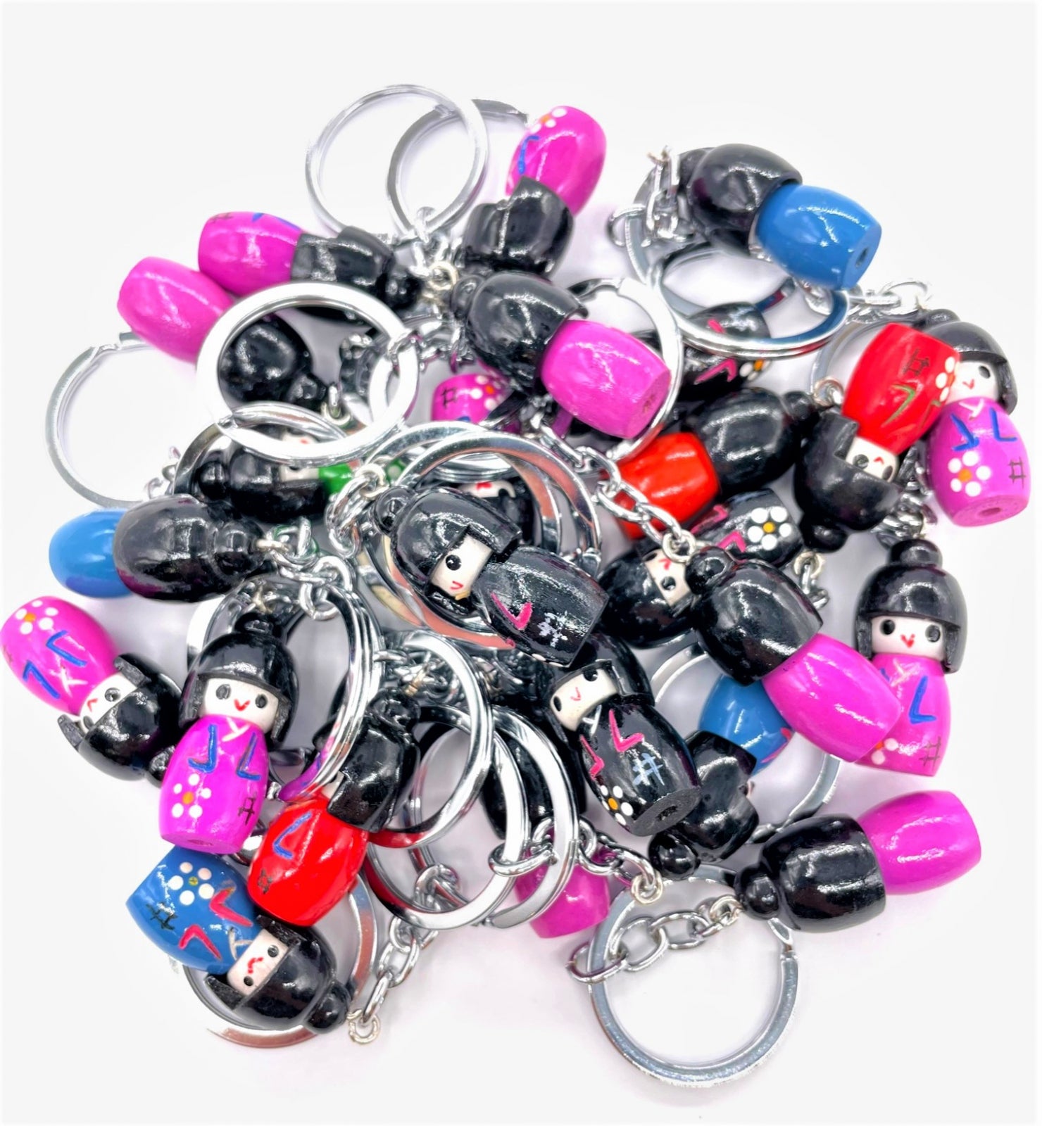 De gelukspoppetjes zijn van hout.\nHandgeschilderd en van topkwaliteit.\n24 stuks sleutelhangers per pak in gemixte kleuren.\nafmetting sleutehangel : 10 cm \nafmetting poptje: 1,5cm x 3,5 cm \n \n