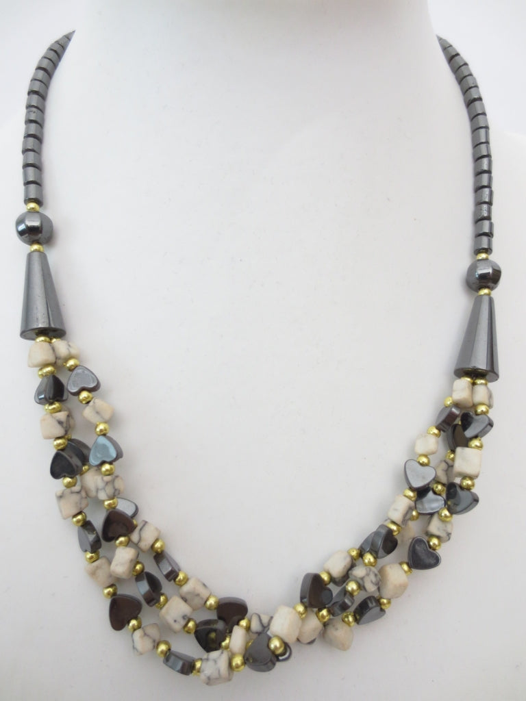 Prachtige hematiet ketting met howliet witte edelsteentjes en hematiet hartjes. Deze ketting bestaat uit 3 lagen. De ketting is 45cm lang.\nMinimale afname is 2 stuks\n