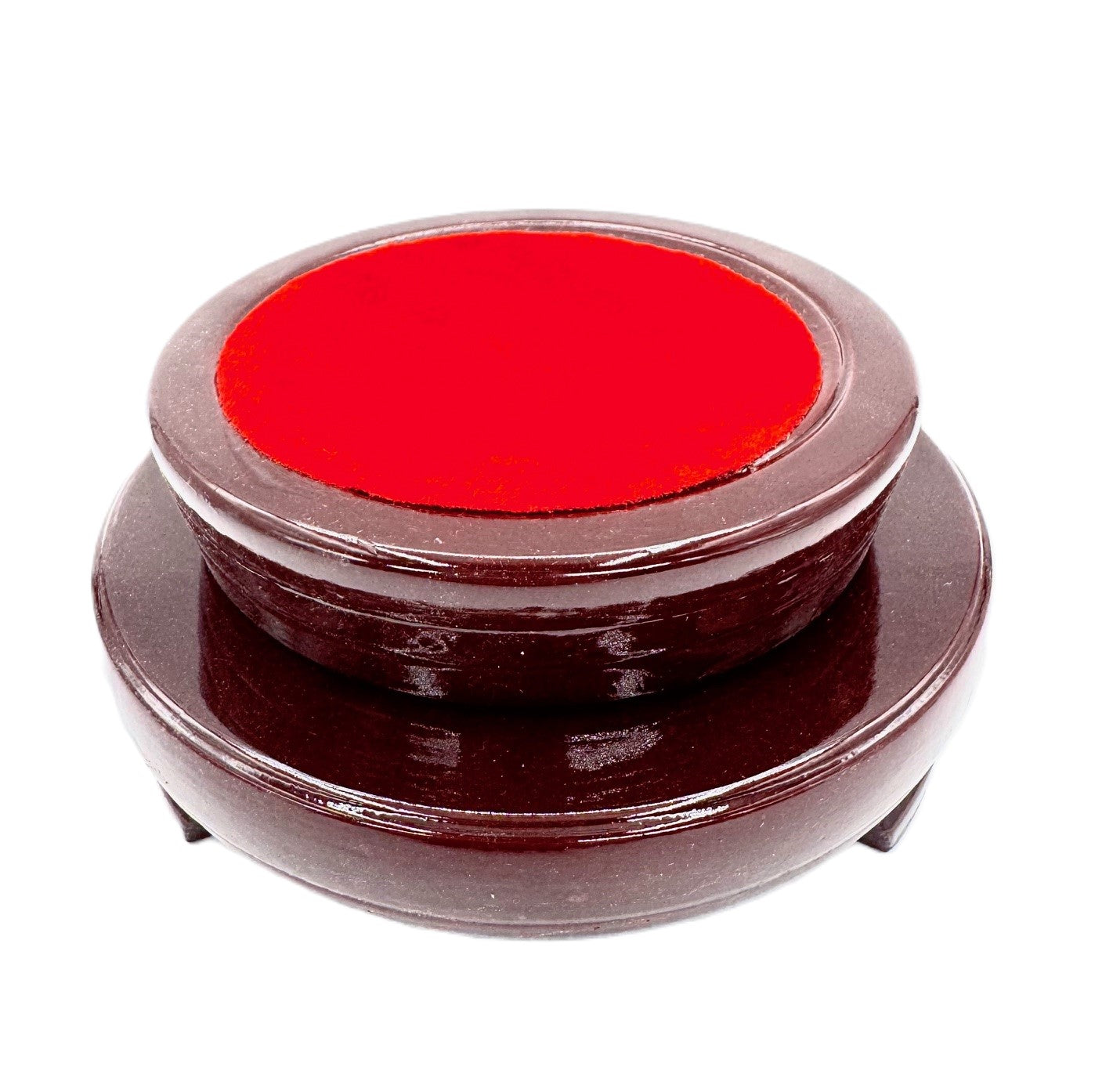 De Kristallkugel-Displayhalter heeft een rode Holzoberfläche en is een drehbar.
