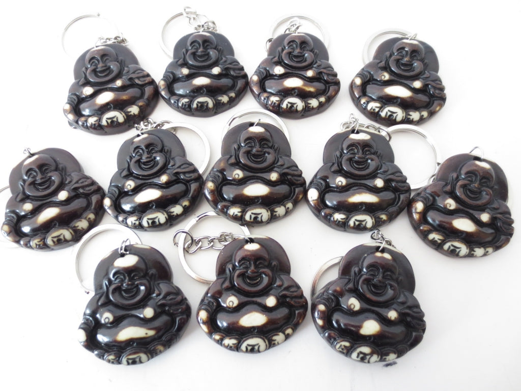 Sleutelhangers met Lachende Boeddha erop. Deze sleutelhanger is verkrijgbaar in het wit en bruin.\nMinimale afname is 1 zak ( per zak zitten er 12 sleutelhangers in)