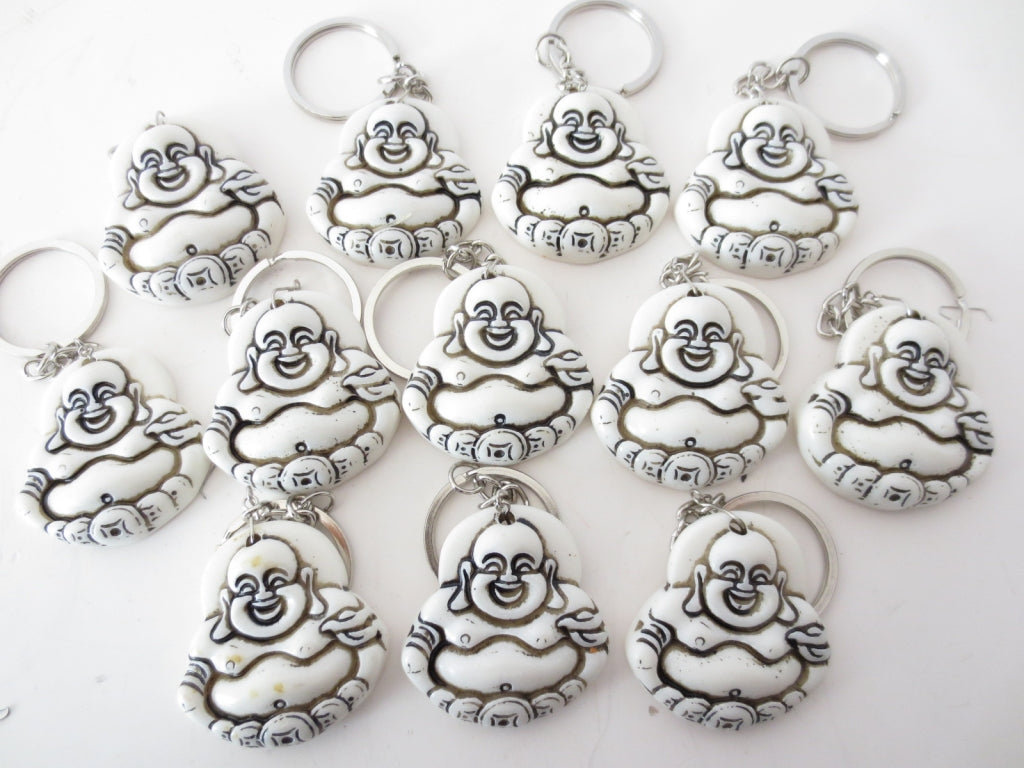 Sleutelhangers met Lachende Boeddha erop. Deze sleutelhanger is verkrijgbaar in het wit en bruin.\nMinimale afname is 1 zak ( per zak zitten er 12 sleutelhangers in)