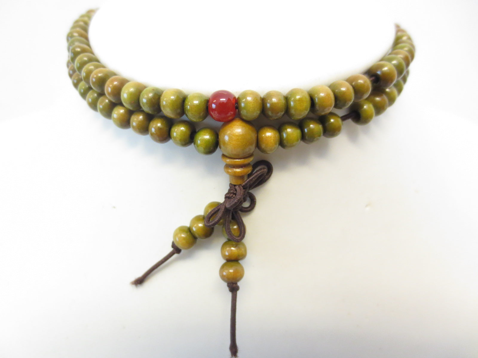 Een Mala is een gebedsketting die vaak door Hindoes en Boeddhisten gebruikt wordt.\nDe kralen zijn gemaakt van sandalhout. Mala wordt gebruikt om het tellen bij te houden bij het chanten van een mantra, een beoefening die in het Sanskriet Japa woord genoemd (herhaling van gebeden, spreuken en godennamen).\nMantra's worden vaak honderden keren omgekeerd. De Mala wordt zo gebruikt dat je alleen nog maar hoeft te denken aan de betekenis van de mantra zonder dat er echt geteld wordt.\nDe Mala ketting bestaat uit 108 gebedskralen. Er zijn vele verklaringen voor het getal van het getal van de 108 kralen. Het nummer 108 heeft een speciale religieuze betekenis binnen het Boeddhisme en het Hindoeïsme.\nAfmetingen: Lengte ketting 30cm breedte kraal 6mm