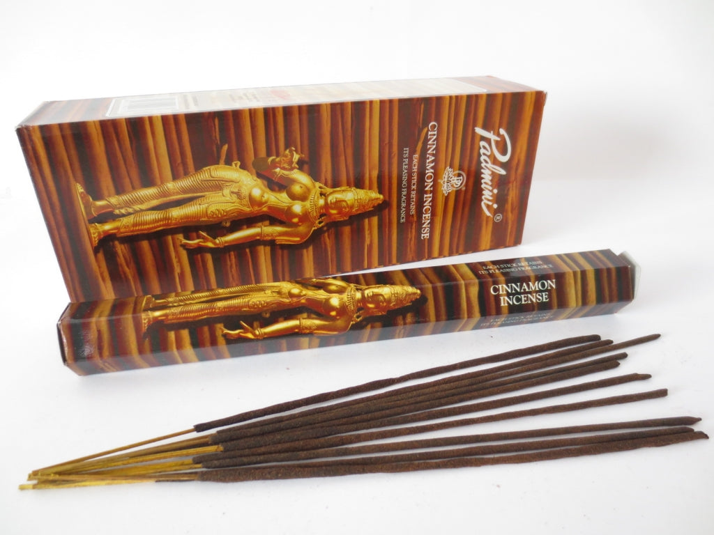 Padmini Cinnamon\n`De kruidige geur van kaneel is fris en warm. Afkomstig van de aromatische binnenschors van een Zuid-Aziatische boom. Kaneelwierook is werkelijk uniek.`\nEr zitten 6 pakjes in één doos, 20 wierookstokjes in één verpakking.