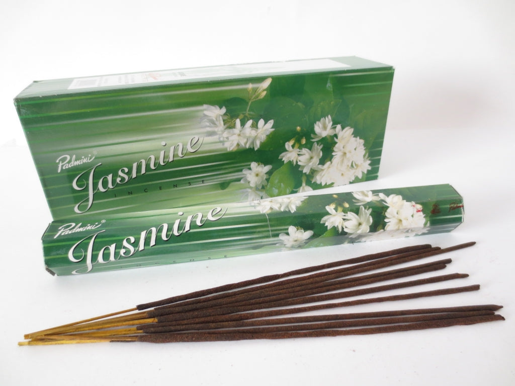Padmini Jasmine \n"Geniet van deze geur gemaakt van jasmijnolie; voel de rust je geest omhullen; de sereniteit kalmeert je ziel."\nEr zitten 6 pakjes in één doos, 20 wierookstokjes in één pakje.