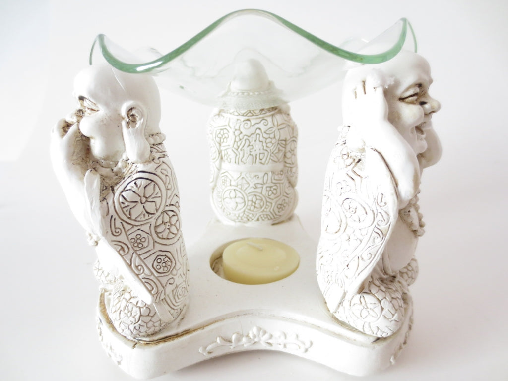 3 gelukkige boeddha's 'horen, zien, zwijgen' oliebrander humor