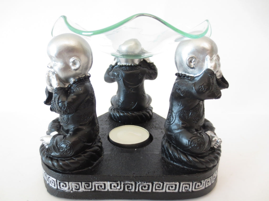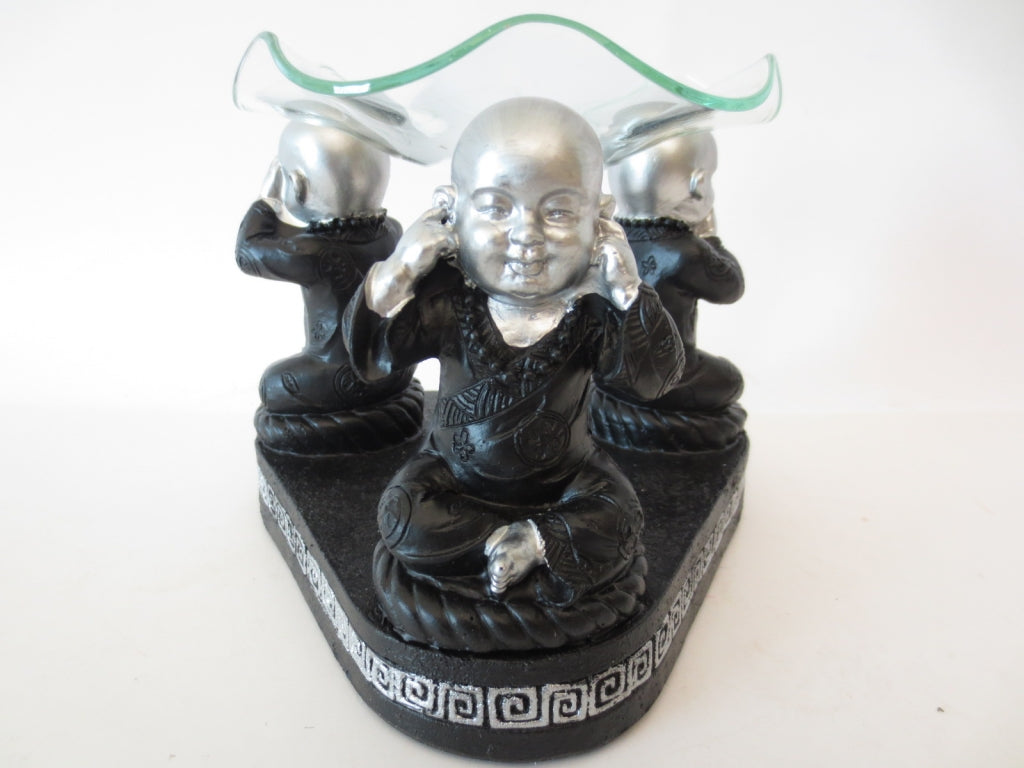 3 monnik, horen, zien,zilver/zwartbe stille oliebrander