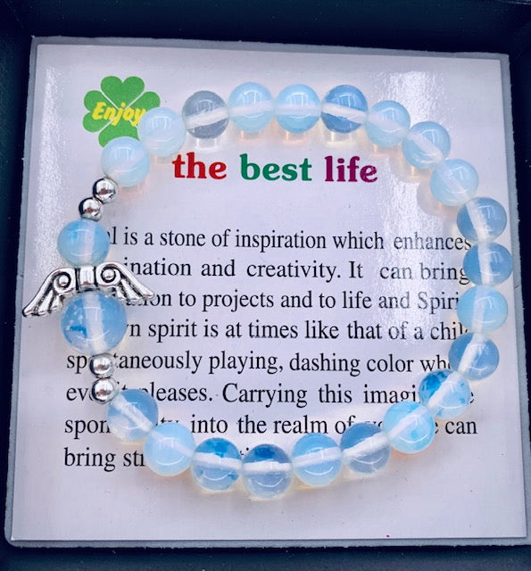 Armband met 19 edelsteen kralen van 8 mm met zilveren engeltjes.