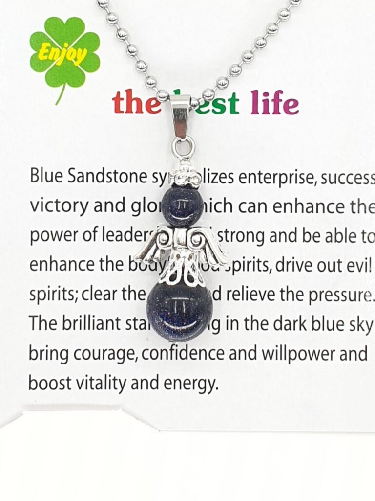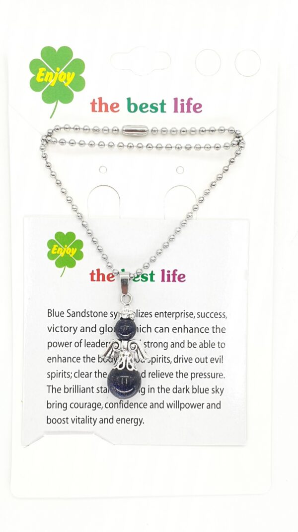 Engelenketting van blauwe goudsteen. \nEngelenketting van edelsteen. Wordt geleverd in een verpakking met kaartje, beschrijving en informatie over de edelsteen.\nDe ketting is 60 cm lang en kan op maat worden geknipt.\nDe minimale afname is 2 stuks.