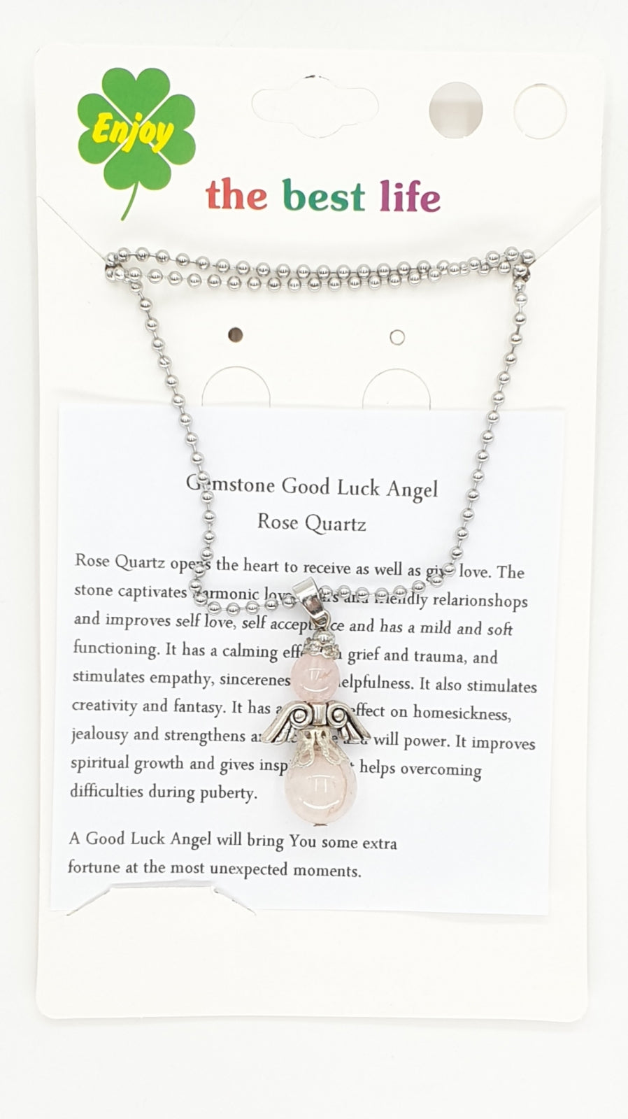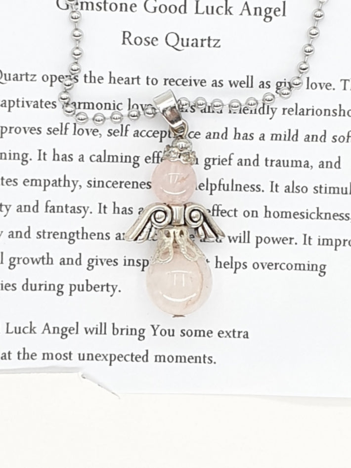 Engelenketting Rozenkwarts\nEngelenketting gemaakt van edelsteen. Wordt geleverd in een verpakking met kaartje, beschrijving en informatie over de edelsteen.\nDe ketting is 60 cm lang en kan op maat worden geknipt.\nDe minimale afname is 2 stuks.