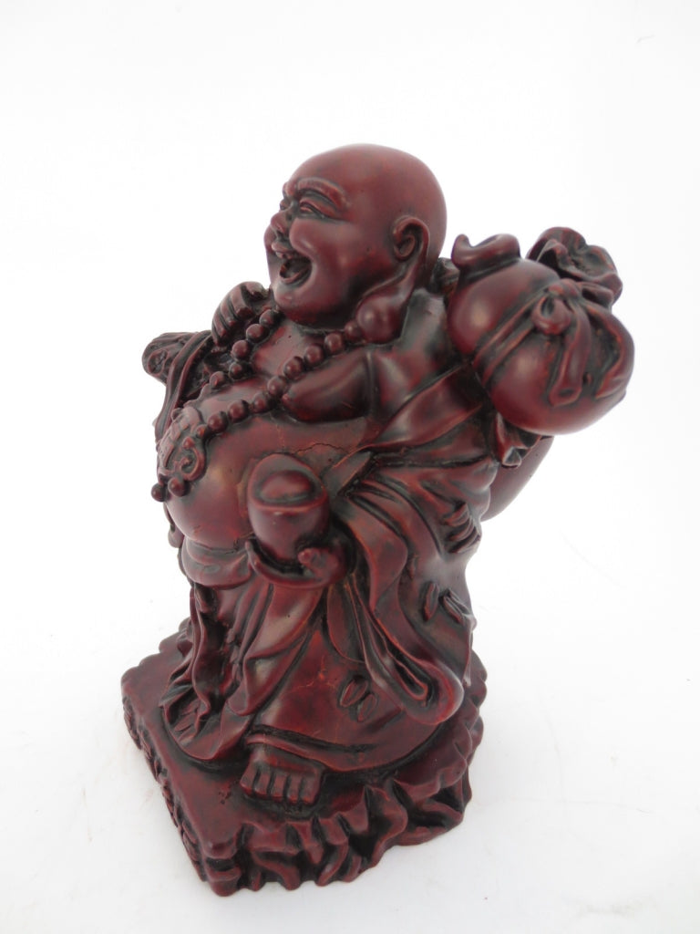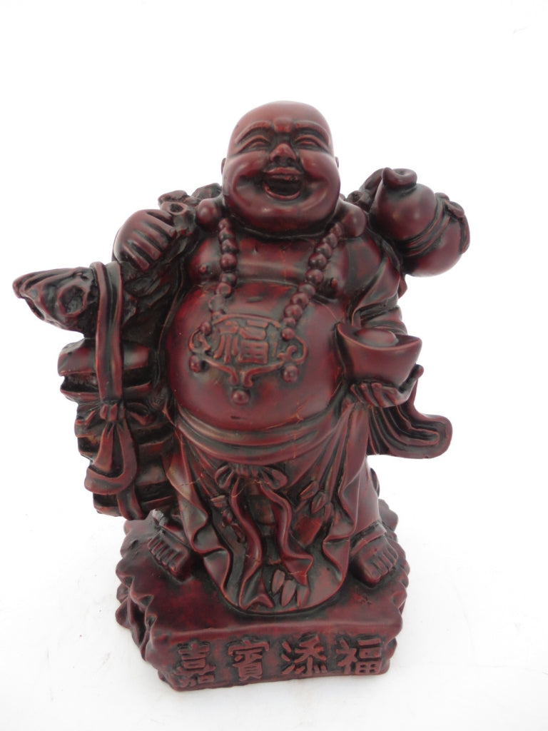 Boedha Rood staand met goud\nMateriaal: PolyresinGewicht: 785 gramAfmetingen: lengte: 12cm x hoogte: 13cm\nDe minimale afname is 2 stuks.