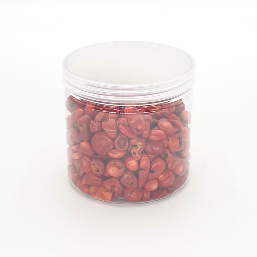 Edelsteencluster Rode Koraal 8-12mm\nEen edelsteen is een stuk mineraal kristal dat in geslepen en gepolijste vorm wordt gebruikt om sieraden of andere decoraties te maken.\nHet potje heeft een diameter van 8 cm en is 8 cm hoog.\nNettogewicht: 400 gram\nDe edelstenen zijn tussen de 8 mm en 12 mm groot.\nDe minimale afname is 2 stuks.