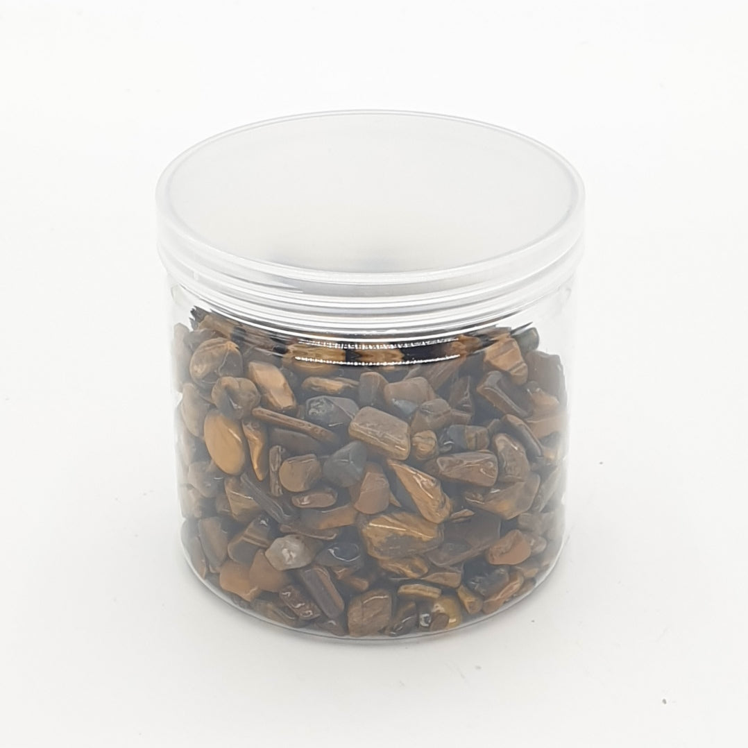 Edelsteencluster Tijgeroog 8-12 mm\nEen edelsteen is een stuk mineraal kristal dat in geslepen en gepolijste vorm wordt gebruikt om sieraden of andere decoraties te maken.\nHet potje heeft een diameter van 8 cm en is 8 cm hoog.\nNettogewicht: 400 gram\nDe edelstenen zijn tussen de 8 mm en 12 mm groot.\nDe minimale afname is 2 stuks.