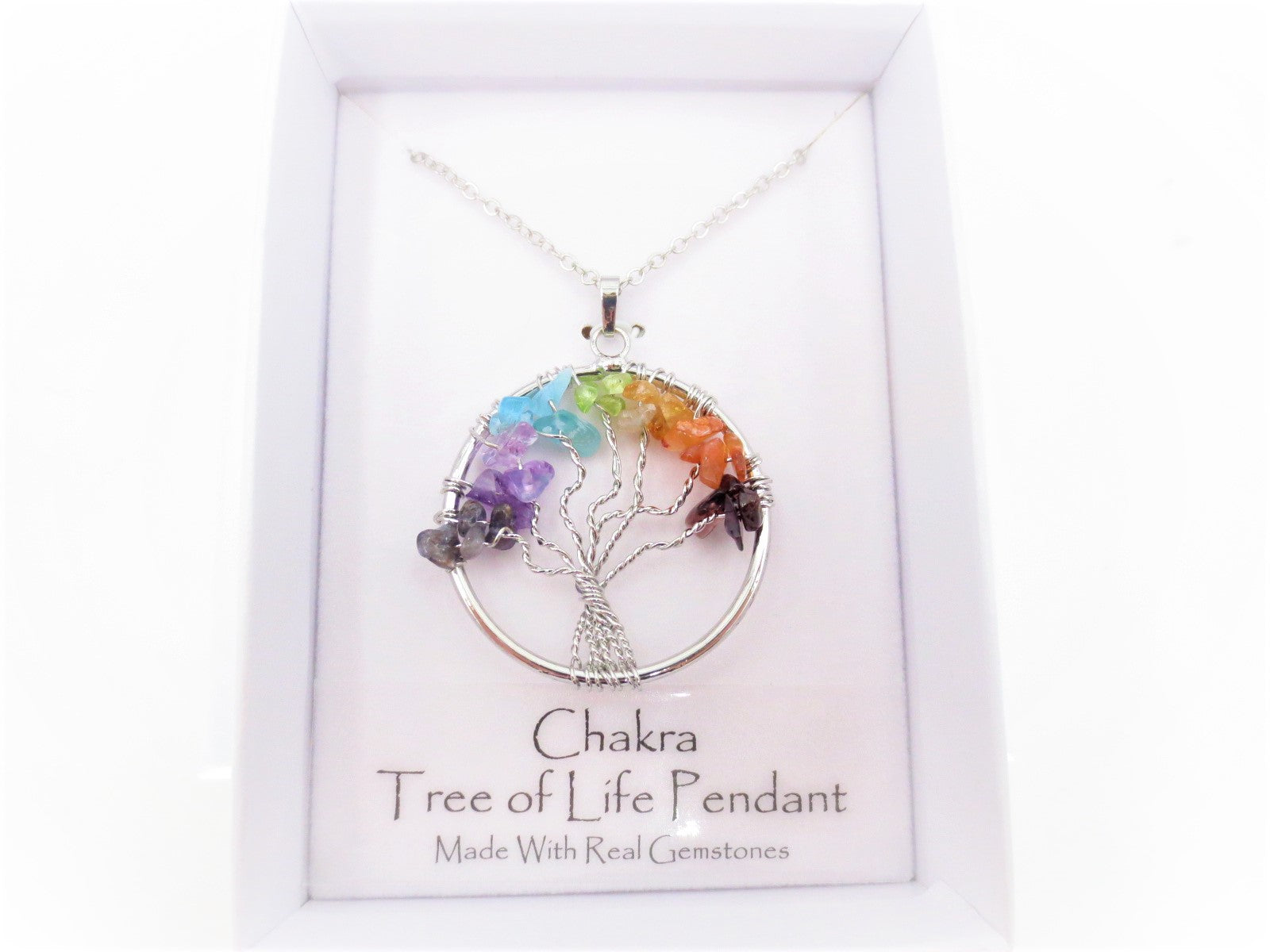 Levensboom kettingset van 12 stuks, gemaakt van echte edelstenen. De ketting is nikkel- en loodvrij. Elke ketting wordt geleverd in een speciale luxe geschenkdoos. Gratis displayset bij aankoop van een volle doos met 12 stuks. Afmetingen: diameter levensboom = 35 mm, ketting = 60 cm.