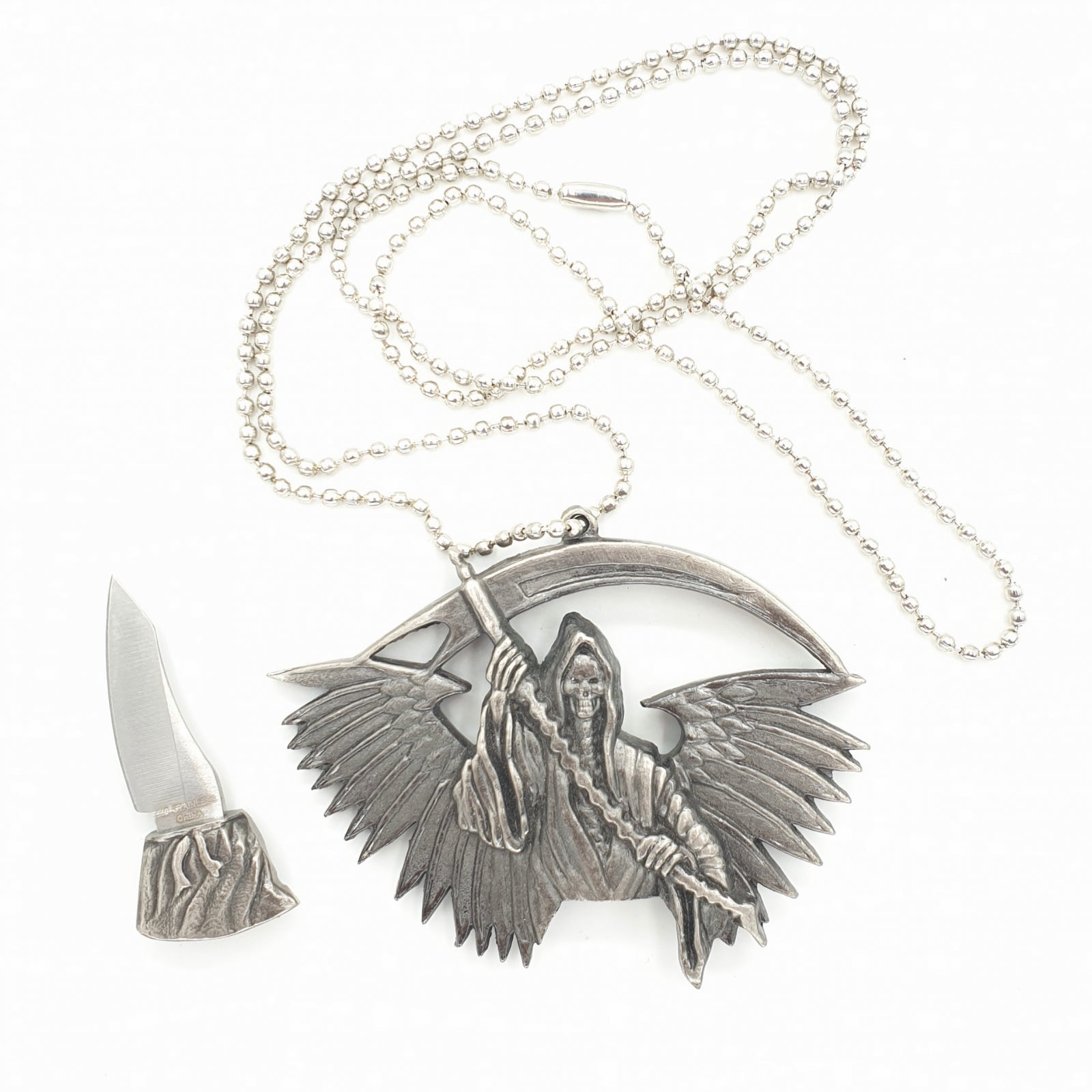 Grim Reaper ketting met mes\nDe ketting is 45 cm lang en bevat een mes dat je eruit kunt halen\nMateriaal: metaal Gewicht: 110 gram Afmetingen: lengte: 8 cm x breedte: 6 cm\nDe minimale afname is 2 stuks.