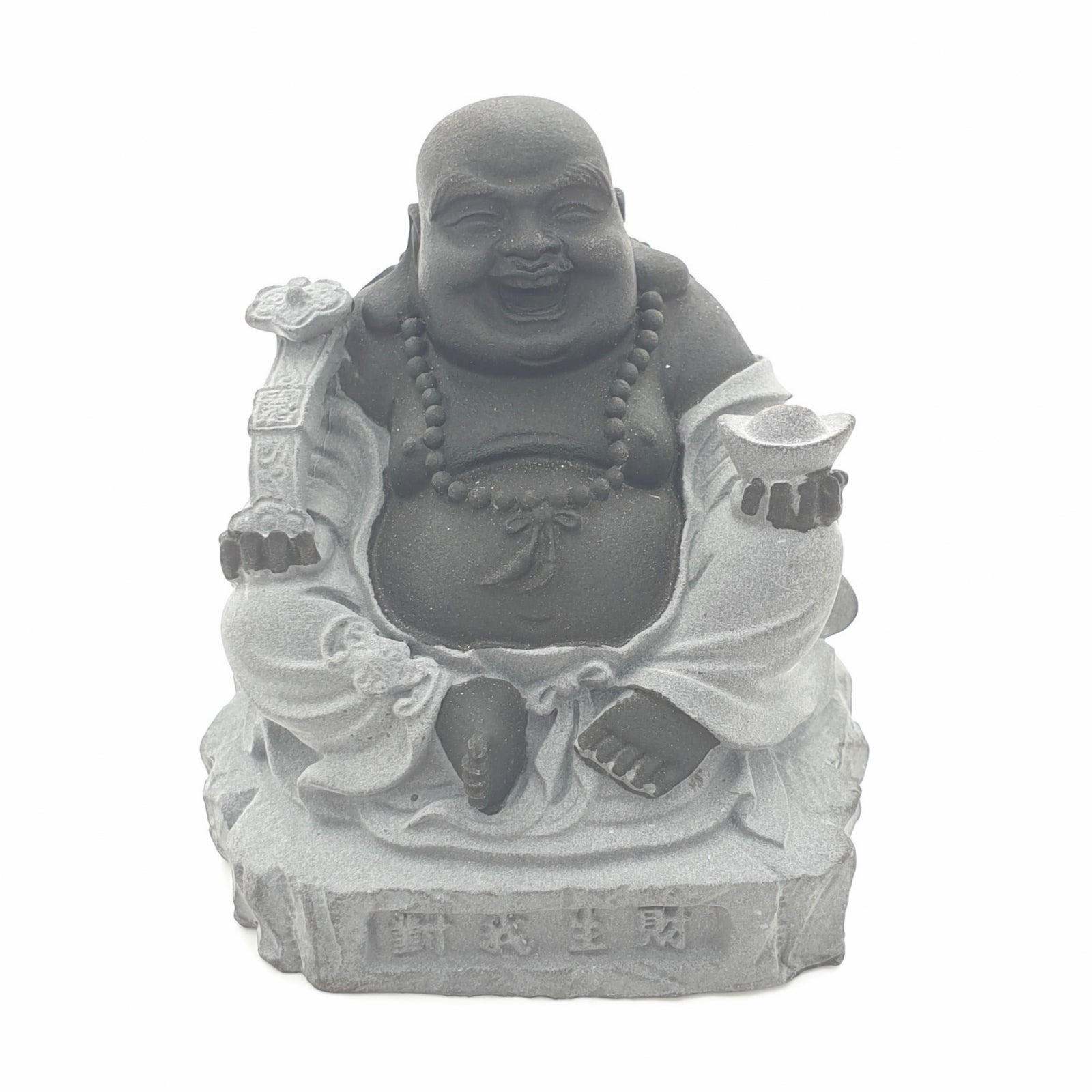 De gelukkige Boeddha staat voor geluk, rijkdom en voorspoed. De gelukkige Boeddha heeft een Yuni in zijn handen en een goudklompje. De Yuni symboliseert het loslaten van verlangens en het klompje staat voor voorspoed en rijkdom. Materiaal: Polyresin Gewicht: 180 gram Afmetingen: lengte: 6 cm x hoogte: 6,5 cm Minimale afname: 2 stuks