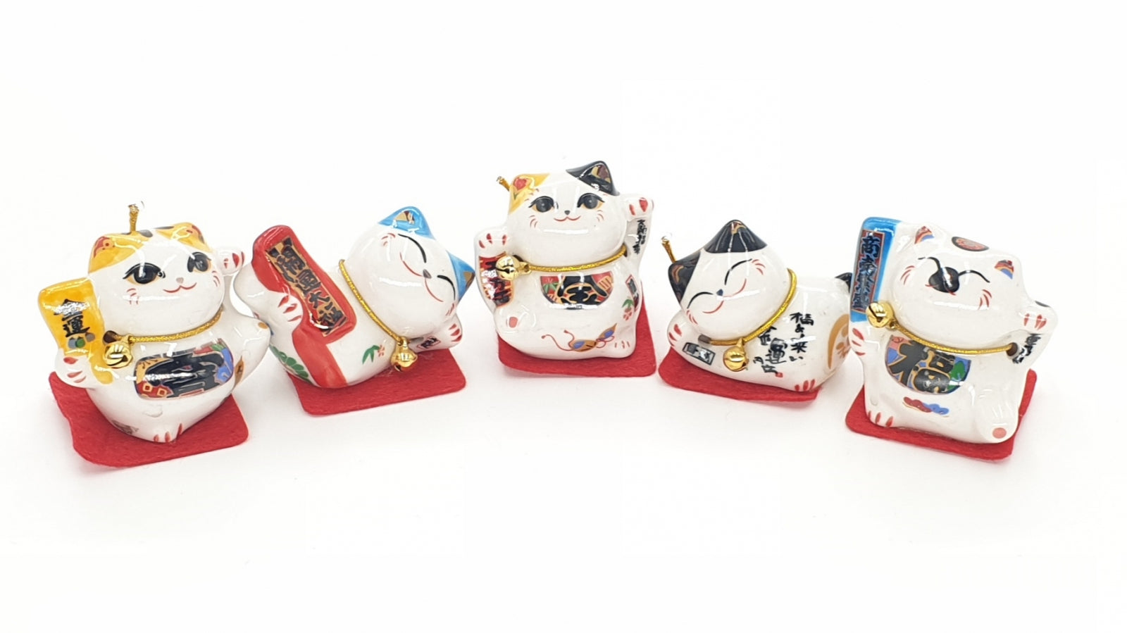 Japanse gelukskattenset van 5, elke gelukskat heeft een gouden ketting met bel. Gemaakt van porselein