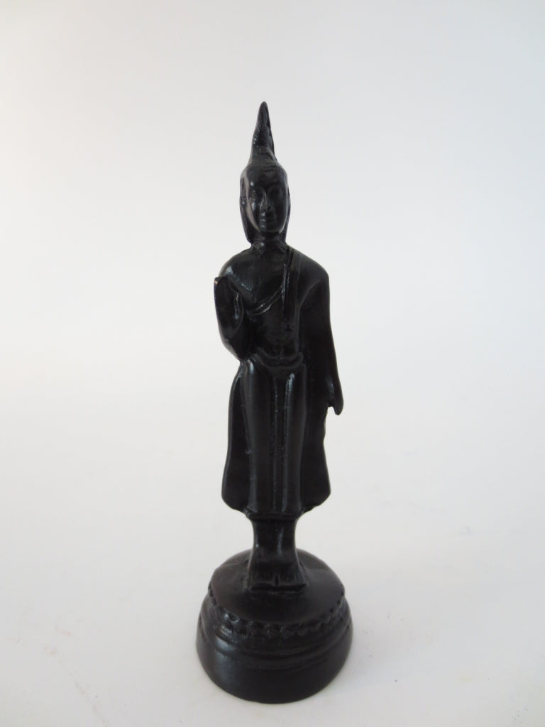 Er wordt gedacht dat bepaalde gebeurtenissen uit het leven van de Boeddha op bepaalde dagen plaatsvonden. De Boeddhabeelden die deze gebeurtenissen weergeven, worden daarom ook geassocieerd met de dagen waarop ze plaatsvonden. Maandag: Het voorkomen van calamiteiten: De stad Vesali werd geteisterd door drie kwaden: armoede, cholera en duivels. Duivels zwierven door de stad en voedden zich met lijken en zelfs mensen. De koning van Vesali kreeg het advies om de hulp van de Boeddha in te roepen. De Boeddha aanvaardde de uitnodiging en arriveerde met gezelschap in Vesali. Met zijn transcendentale krachten liet hij een zware regenbui neerkomen, zo hevig dat de stad werd gereinigd van alle lijken en onreinheid. Materiaal: Polyresin Gewicht: 30 gram Afmetingen: lengte: 3 cm x hoogte: 10 cm Minimale afname is 3 stuks, ook per set verkrijgbaar
