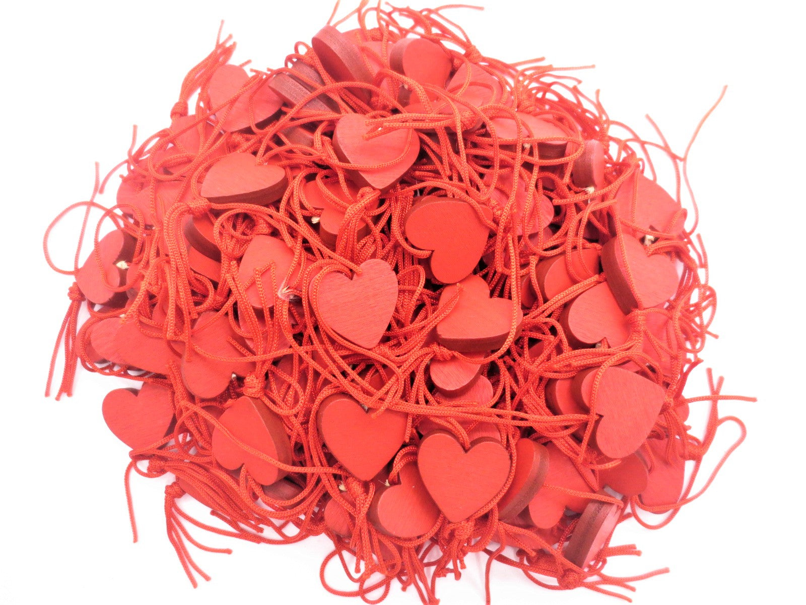 Gelukshanger in de vorm van een rood hart. Er zitten 100 stuks in een zakje.