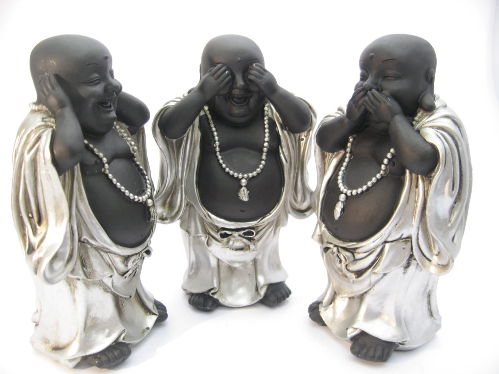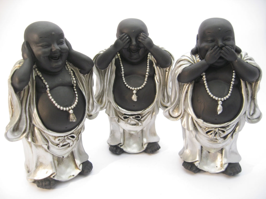Groothandel - Medium horen, zien, zwijgen lachende Boeddha zilver/zwart staand