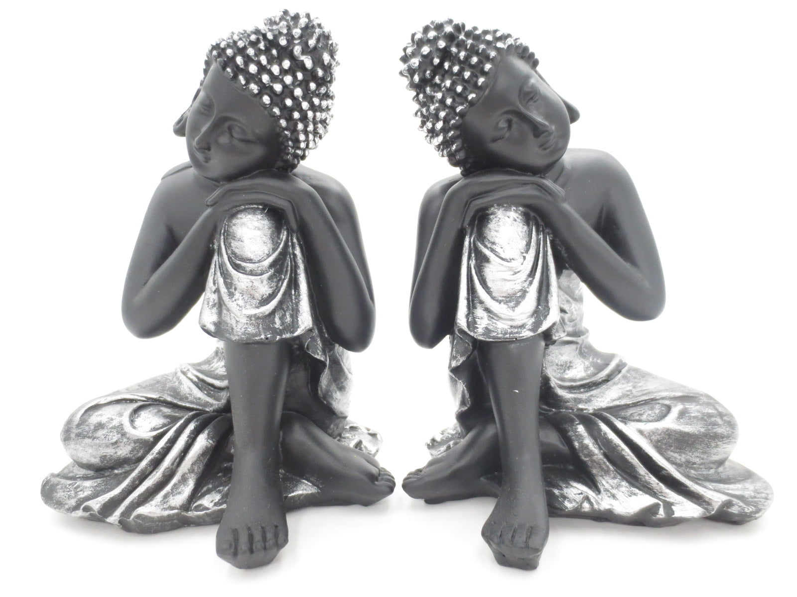 Slapende Boeddha in het zilver/zwart. verkrijgbaar in 3 verschillende maten.\nMateriaal: Polyresin\nGewicht: 600 gramAfmeting: Breed: 12 cm x Hoogte: 16cm\nDe minimale afname is 1 set.\nPrijs is per stuk excl.btw\n \n