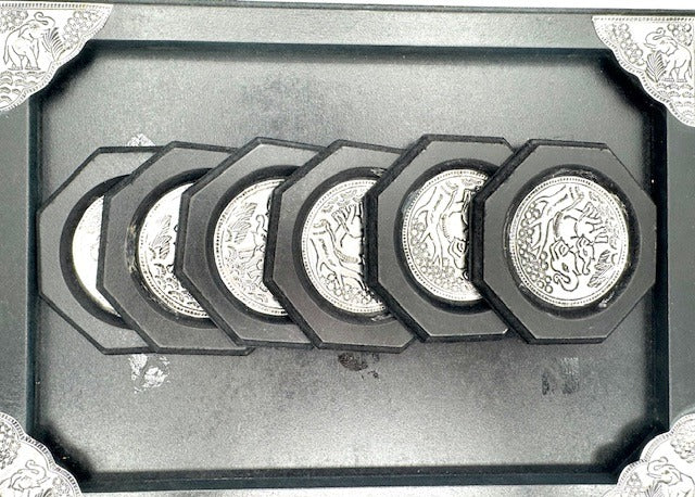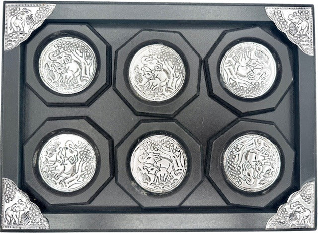 \nDeze handgefertigte Untersetzer-Set besteht aus sechs Metaluntersetzern met detaillierte Elefantenprägung, die wonderbaarlijk op een Holztablet wordt gerangschikt zoals.