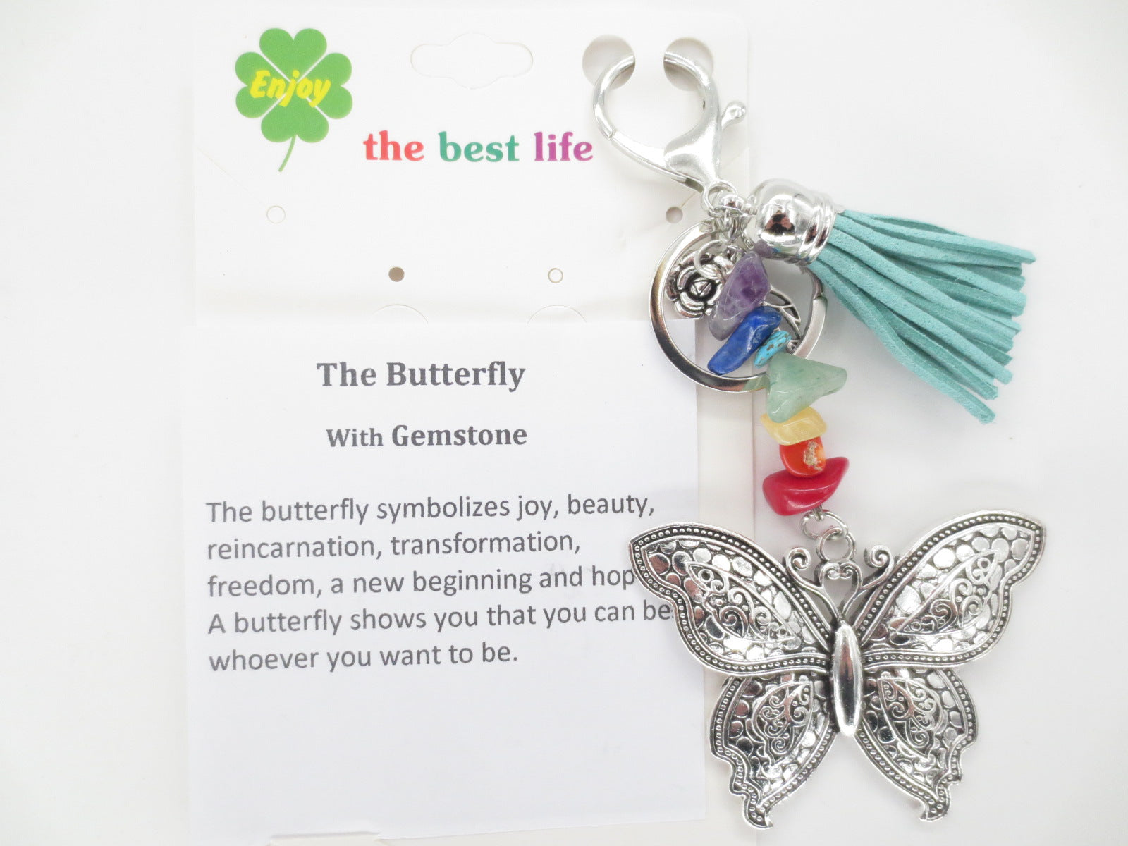 Zilveren Vlinder sleutelhanger met kraaltjes, klavertje en veertje decoratie.