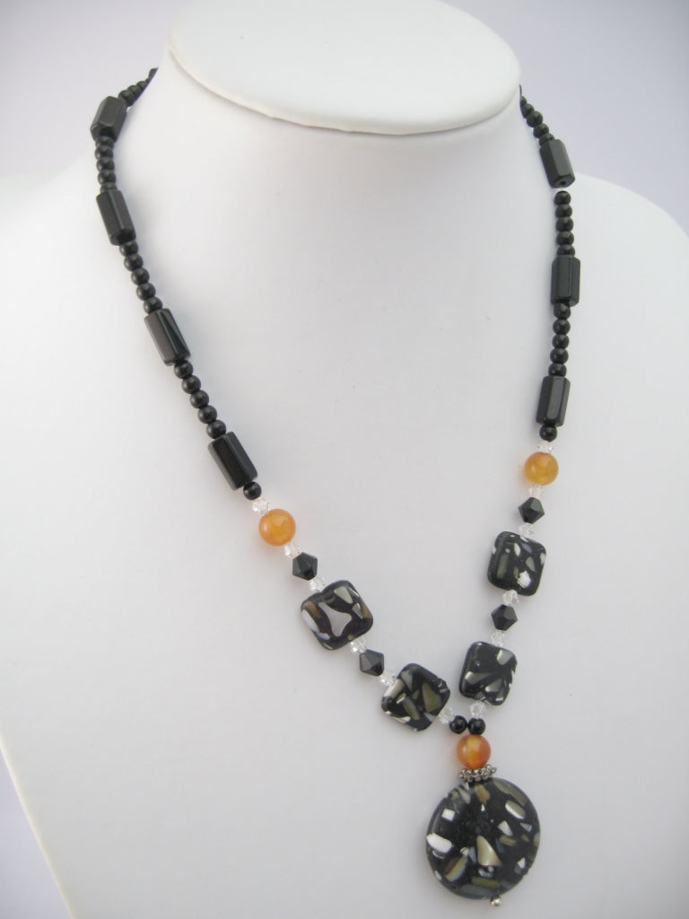 De ketting is verkrijgbaar in 6 verschillende stenen:\n- Zwart/Grijs\n- Goudsteen\n- Lavasteen\n- Jade\n- Howliet Wit\n- Rozenkwarts\nDeze stenen kettingen bevatten een grote ronde edelsteen en kleinere vierkante edelsteentjes. Ook zitten er kleine kraaltjes en diamantjes aan\nU kunt het product bekijken door middel op de afbeelding te klikken.\n \nAfmetingen Ketting:\n \nlengte: 45cm, verstelbaar tot extra 5cm\n